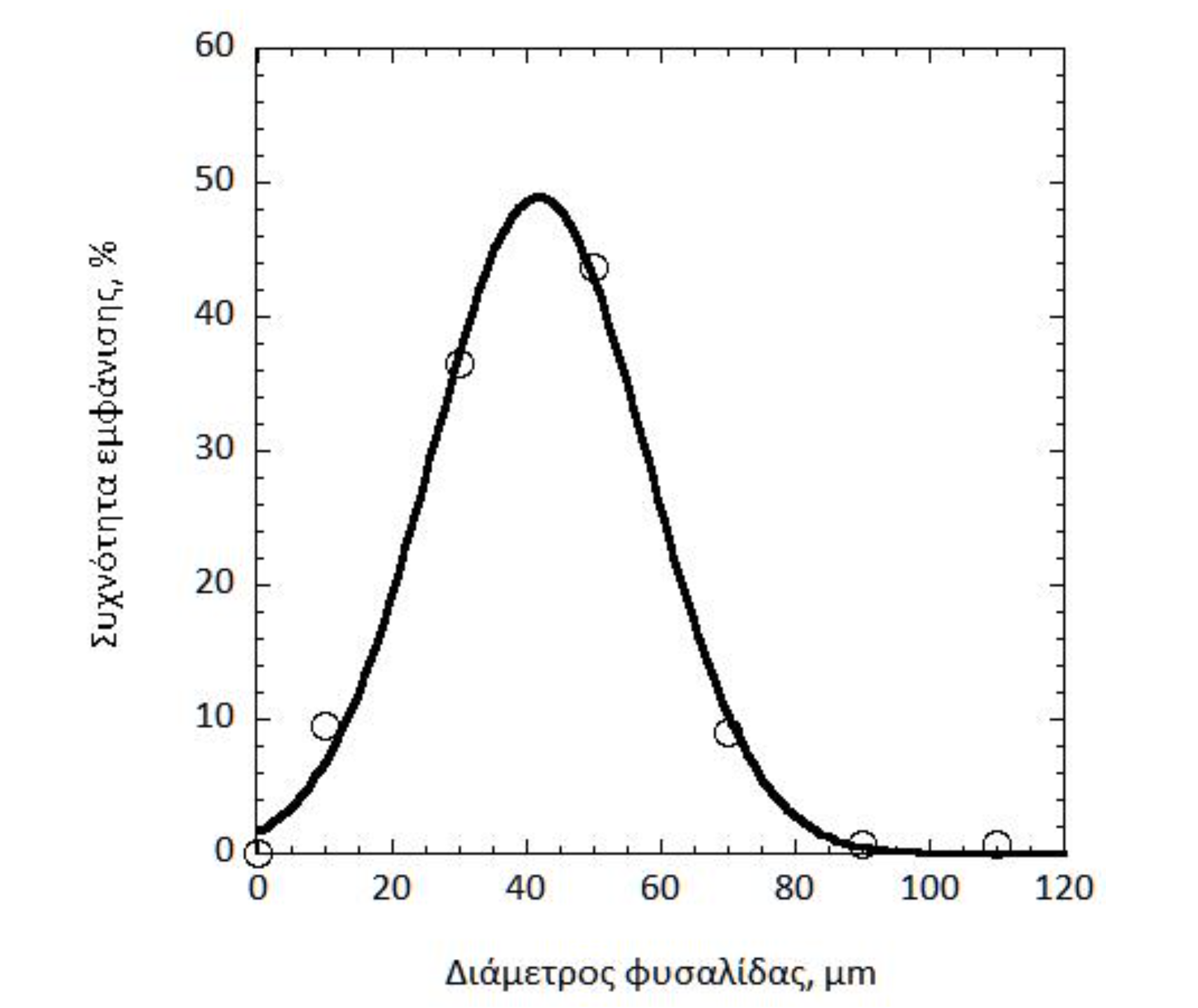 Όπως φαίνεται στο Σχήμα 5, το μέγεθος των φυσαλίδων ακολουθεί κανονική κατανομή με μέσο μέγεθος τα 42 μm.